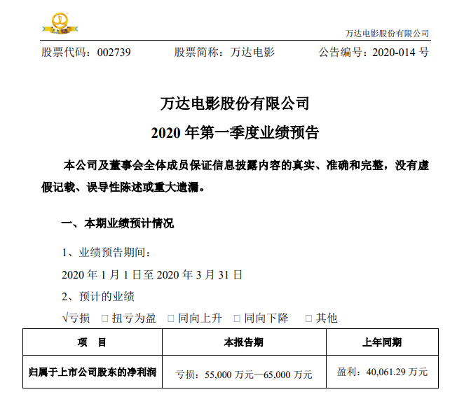 万达电影公布,预计2020年第一季度归属于上市公司股东的净亏损5.5亿元-6.5亿元,上年同期盈利40061.29万元。