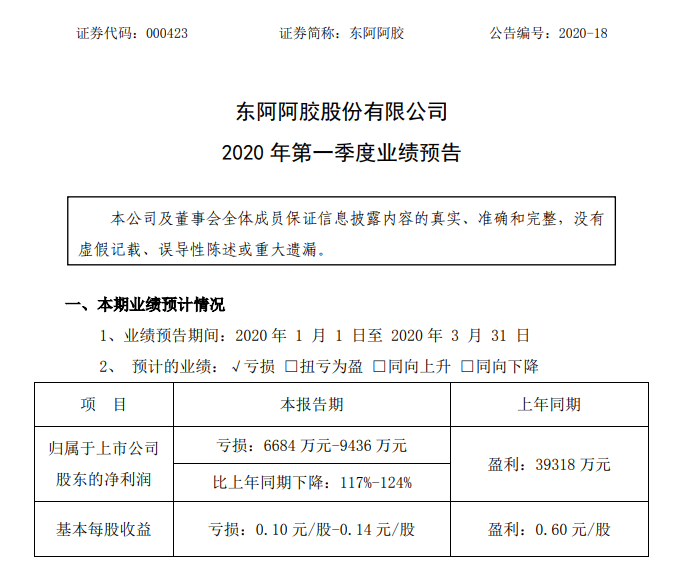 东阿阿胶2020年第一季度业绩预告,归属于上市公司股东的净利润亏损6684万元-9436万元,同比下降117%-124%,上年同期盈利3.93亿元。