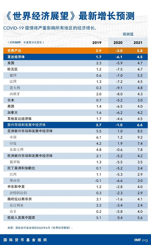 IMF表示,由于疫情预计2020年全球经济增速为-3%,此前预期为3.3%。基线情景假设疫情在2020年下半年消退,在这一情景中,随着政策支持措施帮助经济活动恢复正常,全球经济预计在2021年增长5.8%。