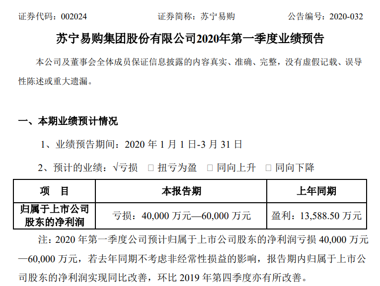 14日晚间,苏宁易购发布一季度业绩预告。受疫情影响,一季度净利润预亏4~6亿。