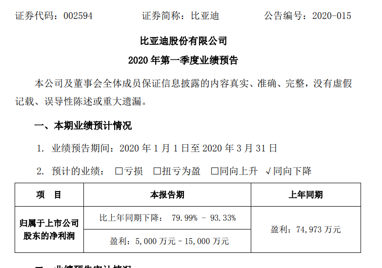 比亚迪:预计一季度净利同比下降79.99%-93.33%
