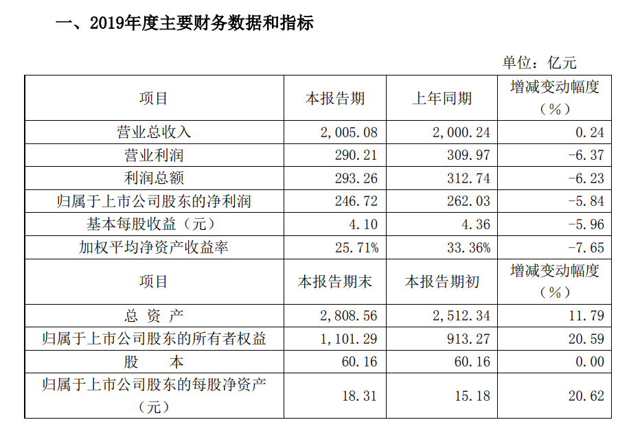 先看年报,2019年实现净利246.72亿元,同比下降5.84%。