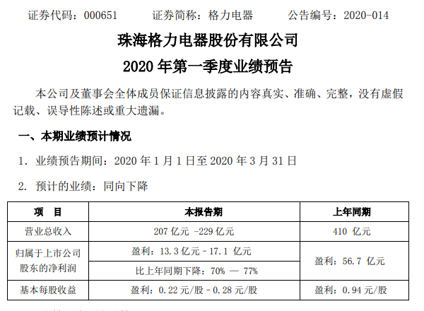 14日晚间,格力电器发了两份财报,一份是2019年年报,一份是一季报。