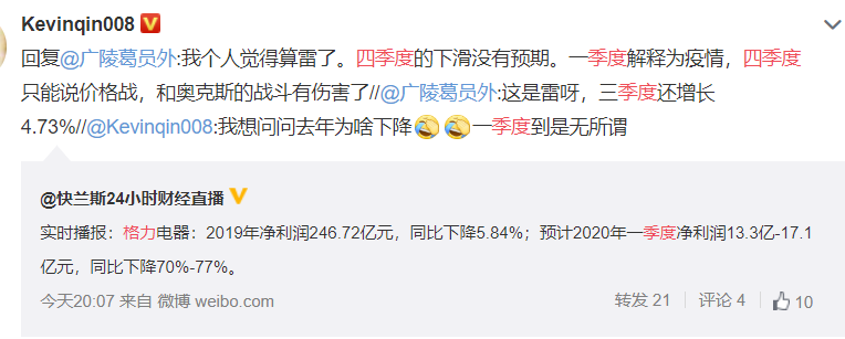 不过市场比较关心的是,为什么格力电器去年第四季度,业绩下滑那么快?单四季度的净利润是25亿左右,而2018年四季度的净利润是50多亿,同比下跌了50%,而2019年第四季度是没有疫情发生的。