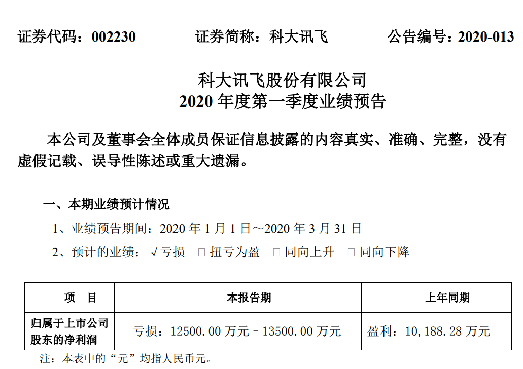 4月14日,科大讯飞发布的2020年度第一季度业绩预告显示,其当期亏损1.25亿元至1.35亿元。市场一时惊诧。科大讯飞已上市12年,2020年一季度出现亏损是其上市以来的一季报首次出现亏损。