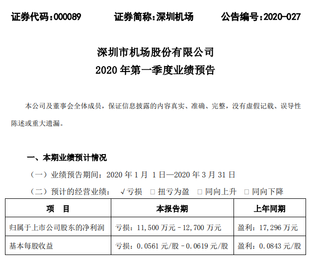 深圳机场:一季度净利亏损1.15亿元-1.27亿元