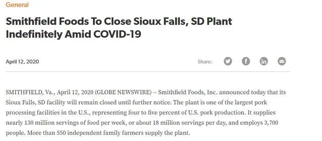 受疫情影响,全球最大猪厂宣布“无限期关闭”,美国猪肉供应将陷入危机?