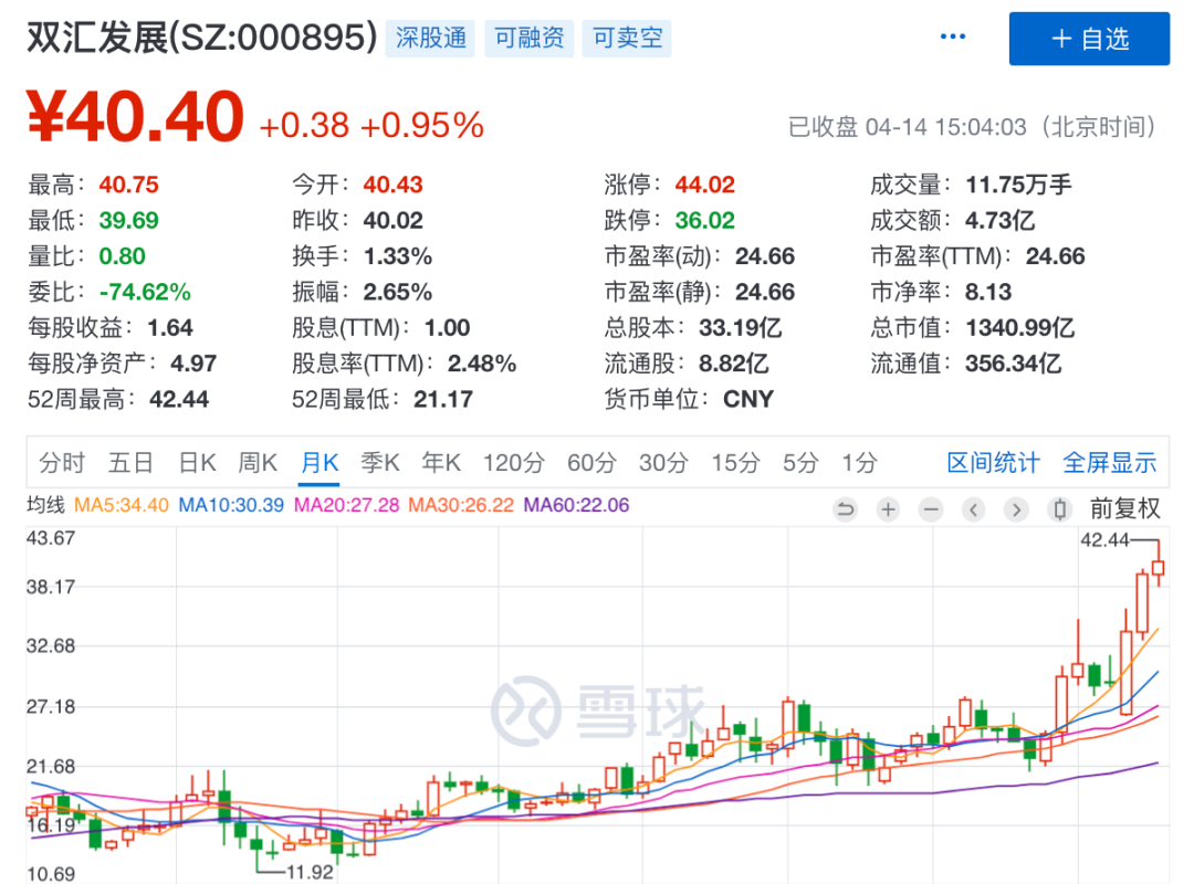 从二级市场反应来看,双汇发展也并未受到影响,股价上涨0.95%。在此之前的4月10日,双汇发展的股价盘中创下42.44元/股的年内新高。今年以来,双汇发展股价已累计上涨逾39%。