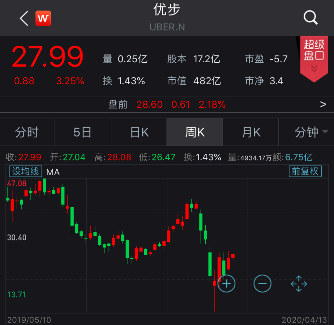 另外,美国共享出行的独角兽—Uber,是软银愿景基金巨亏的另一个罪魁祸首。上市之后,股价便一路跌跌不休,2020年3月股价一度跌至13.7美元,较发行价(45美元)跌幅近70%。