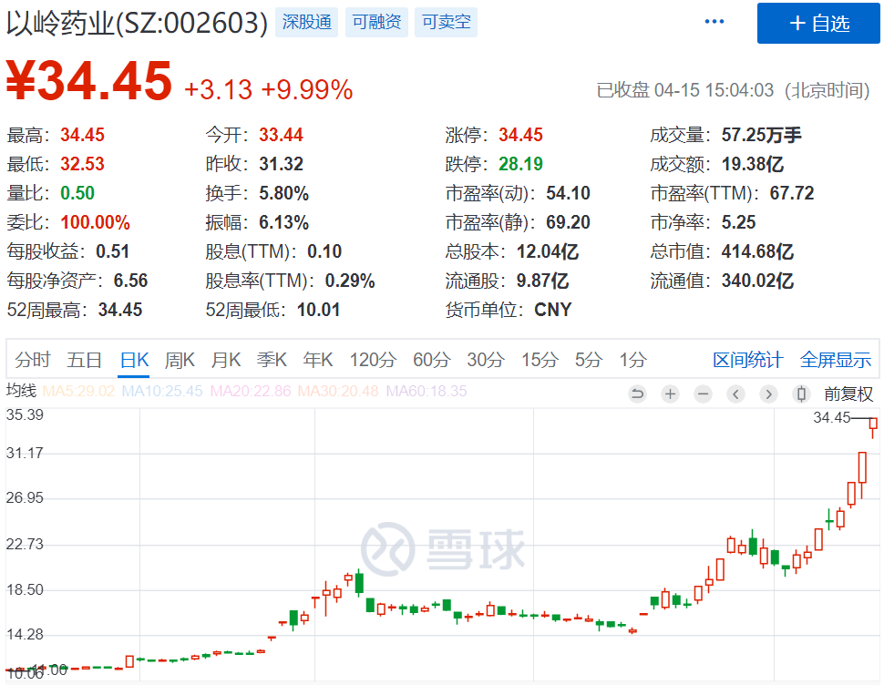今日(4月15日),飙升200%的大牛股—以岭药业(002603)再度逆势涨停,股价升至34.45元/股,总市值亦攀升至415亿元。