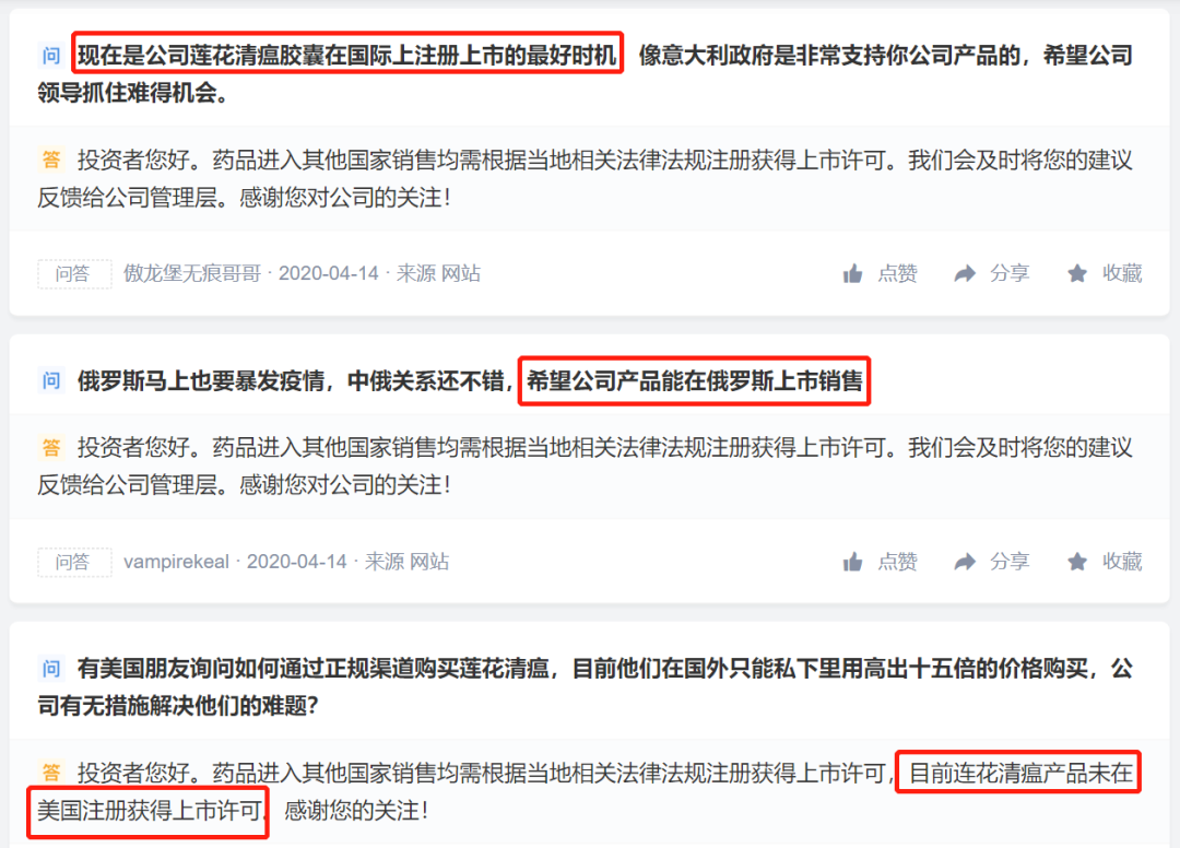 值得一提的是,A股投资者非常关注连花清瘟胶囊的出口情况。4月以来,在投资者关系互动平台上,针对以岭药业的提问主要以海外市场销售的进展为主。