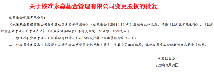 按照证监会官网最新信息,3月23日证监会核准了永赢基金变更股权的事项,允许利安资金管理公司将持有的永赢基金28.51%股权转让给华侨银行有限公司。