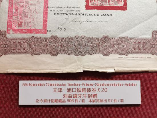 记者在博物馆看到,新理益集团有限公司董事长、天茂实业集团股份有限公司董事长刘益谦热衷收藏和证券公益事务,他向中国证券博物馆无偿捐赠了总计806件的金融类藏品。上图为“天津-浦口铁路债券”。