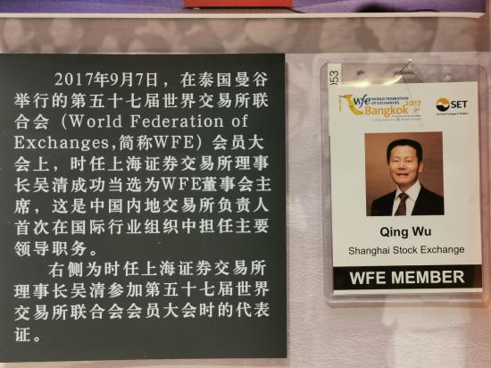 在参观中国证券博物馆过程中,记者来到“重要成就”展厅。2017年9月,在泰国曼谷举行的第57届世界交易所联合会(WFE)会员大会上,时任上交所理事长吴清成功当选为WFE董事会主席,这是中国内地交易所负责人首次在国际行业组织中担任主任领导职务。