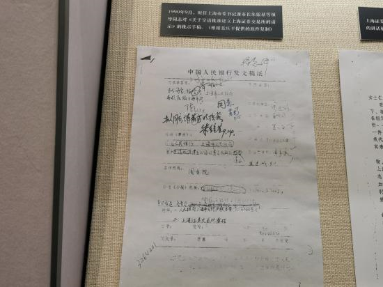 证券时报记者在中国证券博物馆看到一张手写稿纸,那是1990年9月,时任上海市委书记兼市长的朱镕基以及其他相关领导同志,对《关于呈请批准建立上海证券交易所的请示》的批示文稿(复制件)。