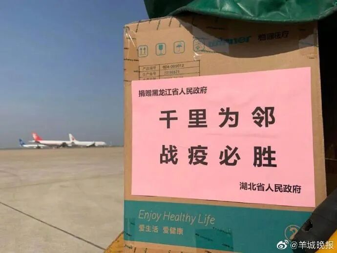 记者看到等待运至机舱内的捐赠物资上都张贴着“千里为邻,战疫必胜”的标语。从1月27日起,黑龙江省共派出8批共计1554名医护工作者援助武汉市和孝感市,黑龙江省委省政府还紧急调集3000吨大米等物资,有力保障了湖北疫情防控物资需求。