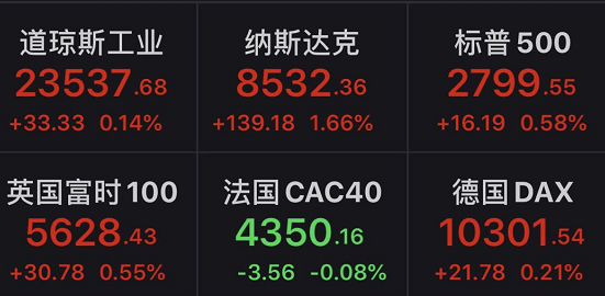 我们再来看看昨晚的美股,截至收盘,道指涨0.14%报23537.68点,标普500涨0.58%报2799.55点,纳指涨1.66%报8532.36点。