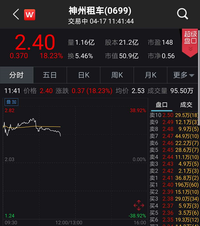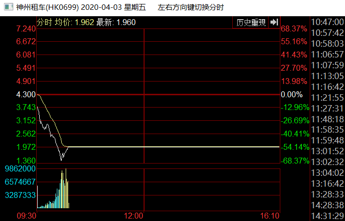 次日(3日)上午,神州租车一度暴跌近70%。随后,临近午盘,暴跌的神州租车停牌,停牌前跌54.42%,报1.96港元,一早上市值蒸发49.6亿港元。