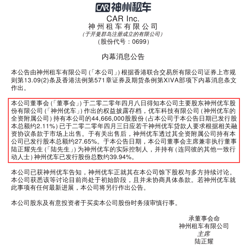 公告显示,神州租车董事会于2020年4月8日得知其主要股东神州优车股份有限公司(以下称“神州优车”)作出的权益披露存档,优车科技有限公司(神州优车的全资附属公司)持有本公司的44,666,000股股份(占本公司于本公告日期已发行股本总额约2.11%)已于2020年4月3日应若干神州优车贷款人要求根据相关融资协议条款于市场上出售。于有关出售后,神州优车透过其全资附属公司持有本公司已发行股本总额约27.65%。