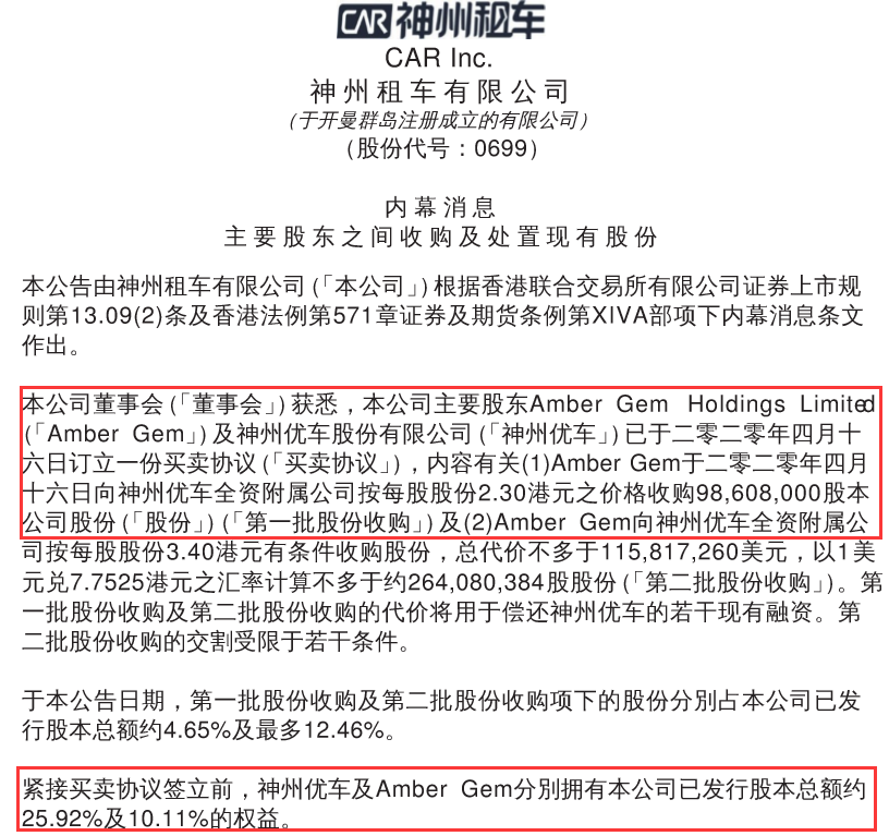 首批股份收购协议显示,Amber Gem于4月16日向神州优车子公司收购9860.8万股神州租车股份,占公司总股本比例约4.65%,每股作价2.3港元,较16日收盘价2.03港元/股溢价13.3%,总计2.26亿港元。