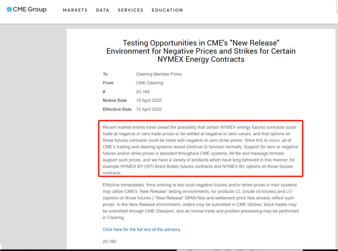 4月15日,芝商所清算所发布测试公告称,如果出现零或者负价格,CME的所有交易和清算系统将继续正常运行,所有常规交易和头寸处理都可以在清算中执行,即已经完成了测试准备。