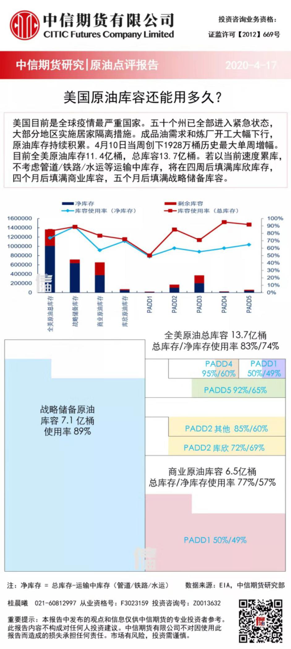 中信期货研究指出,若以当前的速度累库,不考虑管道/铁路/水运等运输中的库存,美国的库欣库存将在四周后填满,四个月后填满商业库存,五个月填满战略储备库存。