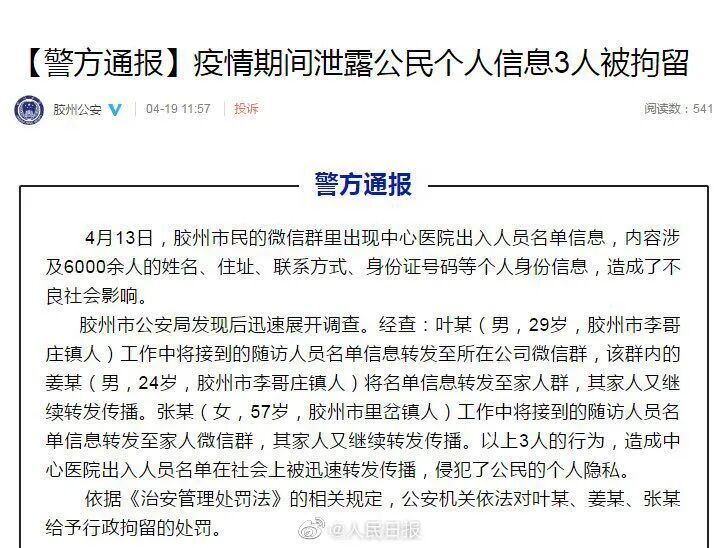 据@胶州公安 4月13日,胶州市民的微信群里出现中心医院出入人员名单信息,内容涉及6000余人的姓名、住址、联系方式、身份证号码等个人身份信息,造成了不良社会影响。经查:叶某(男,29岁,胶州市李哥庄镇人)工作中将接到的随访人员名单信息转发至所在公司微信群,该群内的姜某(男,24岁,胶州市李哥庄镇人)将名单信息转发至家人群,其家人又继续转发传播。张某(女,57岁,胶州市里岔镇人)工作中将接到的随访人员名单信息转发至家人微信群,其家人又继续转发传播。