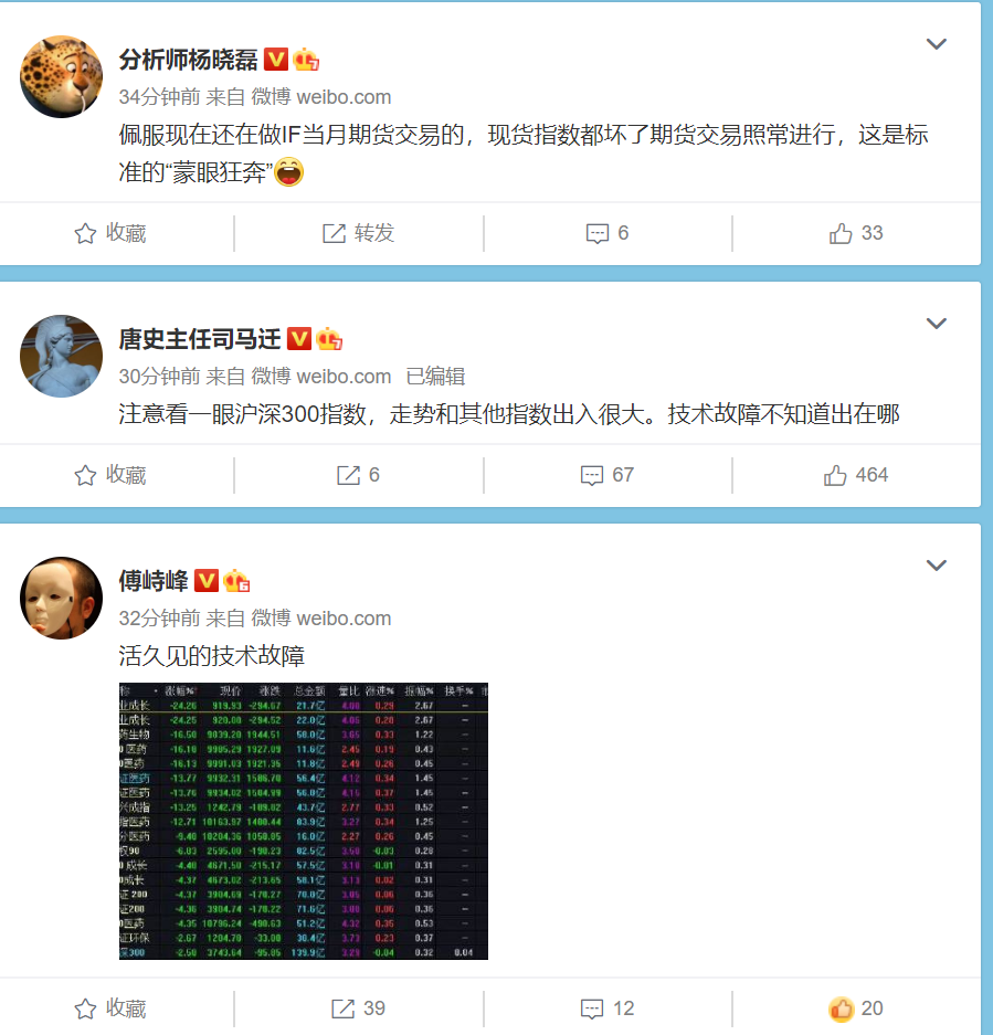 对此,上交所在微博发文回应,4月20日上午,中证1000、沪深300、全指医药等部分跨市场指数出现异常。目前上海证券交易所正会同指数编制机构中证指数有限公司就相关原因进行排查。