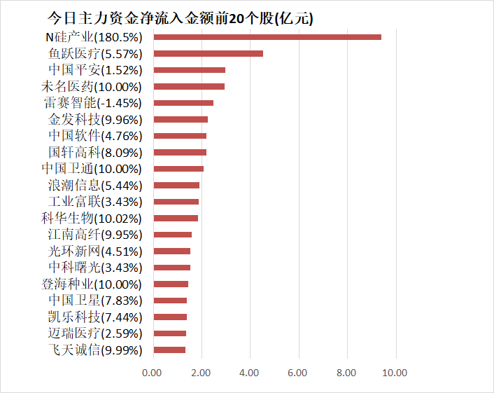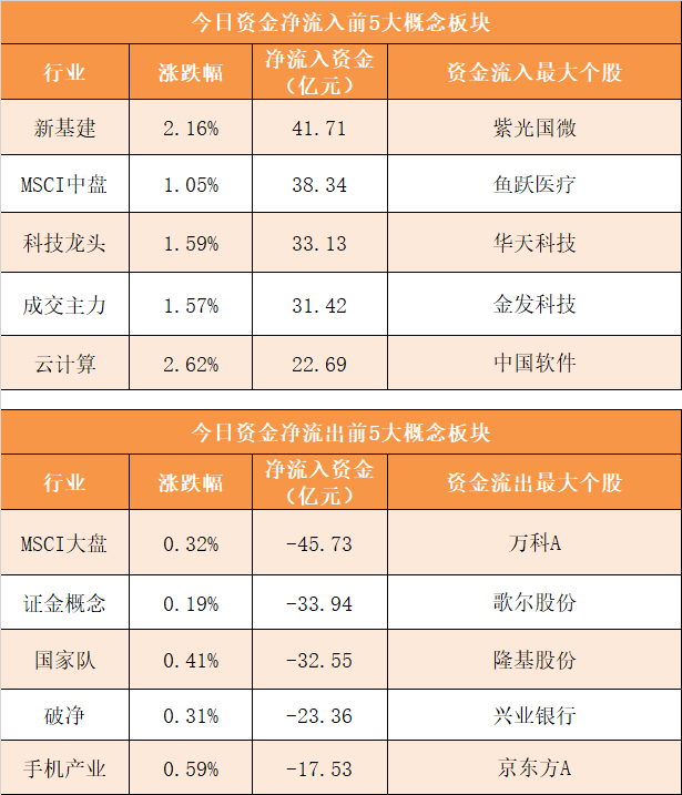 概念板块方面,今日新基建、MSCI中盘、科技龙头、成交主力等概念板块资金呈现净流入,其中新基建概念净流入41.71亿元居首。