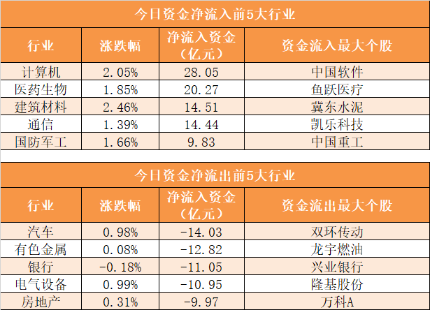 28个申万一级行业中,11个行业实现资金净流入,其中计算机行业净流入28.05亿元居首。