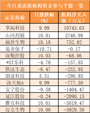 盘后龙虎榜数据显示,机构现身13股,其中掌阅科技等3只股票呈现机构资金净买入,迈克生物等10股呈现机构资金净卖出。
