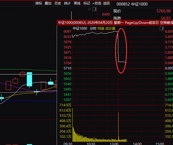 下午1点开盘,上述指数恢复正常显示,表现在修正后的行情图上,就是中证1000指数下午开盘后断崖式“跳水”,而沪深300指数则在下午开盘后暴力“拉升”。