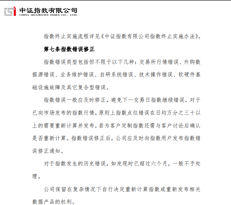 对于指数的发布和管理,中证指数公司制定了多项规则,其中在指数管理基本规则中,对于指数可能发生的错误,中证指数公司亦有相关规定。