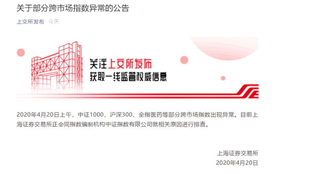 上交所公告称,2020年4月20日上午,中证1000、沪深300、全指医药等部分跨市场指数出现异常。目前上海证券交易所正会同指数编制机构中证指数有限公司就相关原因进行排查。