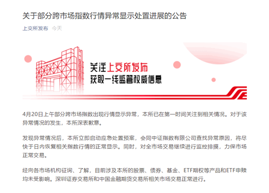 午间,上交所发布进一步处置进展公告表示,4月20日上午部分跨市场指数出现行情显示异常,上交所已在第一时间关注到相关情况。对于该异常情况的发生,上交所深表歉意。