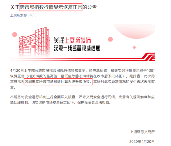 上交所表示,4月20日上午部分跨市场指数出现行情异常显示,经应急处置,指数实时行情显示已于13时恢复正常(相关指数的最高值、最低值等静态指标将在收市后予以补正)。经排查,此次异常显示系因周末上交所跨市场指数计算系统升级所致。上交所对此次异常情况的发生再次表示歉意。