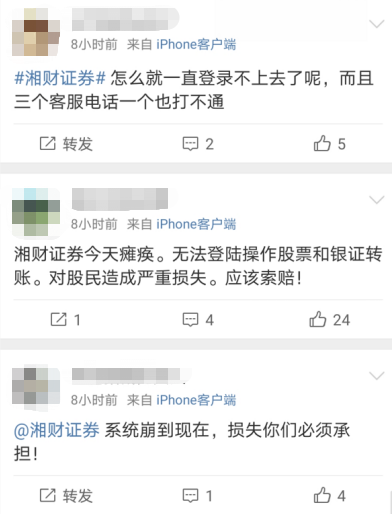 在短暂出现宕机问题之后,两家券商APP均在上午即恢复正常交易。不过仍有多名股民要求券商“给个说法”,并要求进行损失赔偿。