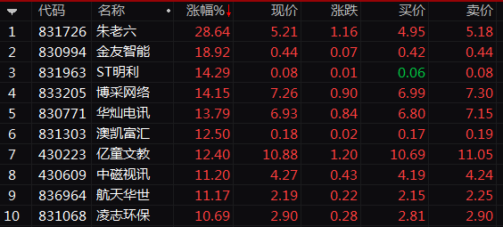 在资金推动下,做市个股普遍暴涨。当天涨幅最高的为捷世智通,涨31.71%;朱老六、点击网络、珠海港昇、中讯四方、利尔达、朗朗教育、新达通、精英智通涨逾20%,另有33家挂牌企业当天涨幅在10%以上。