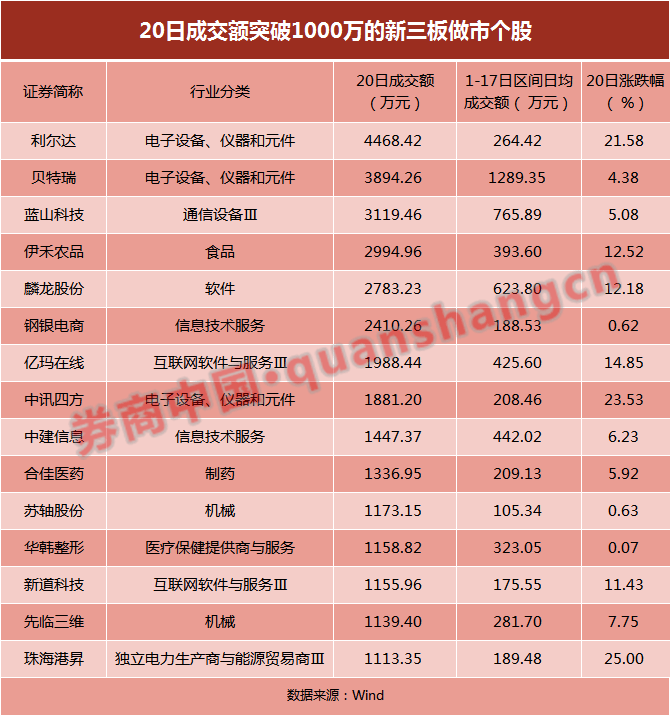 多只个股迎来资金涌入。根据券商中国记者统计,4月1日至4月17日期间,日均成交额超过300万的做市个股只有12只,该数量在4月20日突破至29只。其中,当天成交额突破千万的有18只。