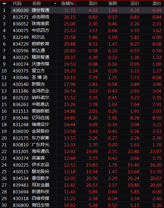 新三板竞价交易的个股中,超20只股票涨幅超50%,其中三同新材、嘉捷通、吉冈精密、优睿传媒等个股涨幅超100%,凯欣股份、网阔信息、斯盛能源、三维股份等多股涨幅超过90%。