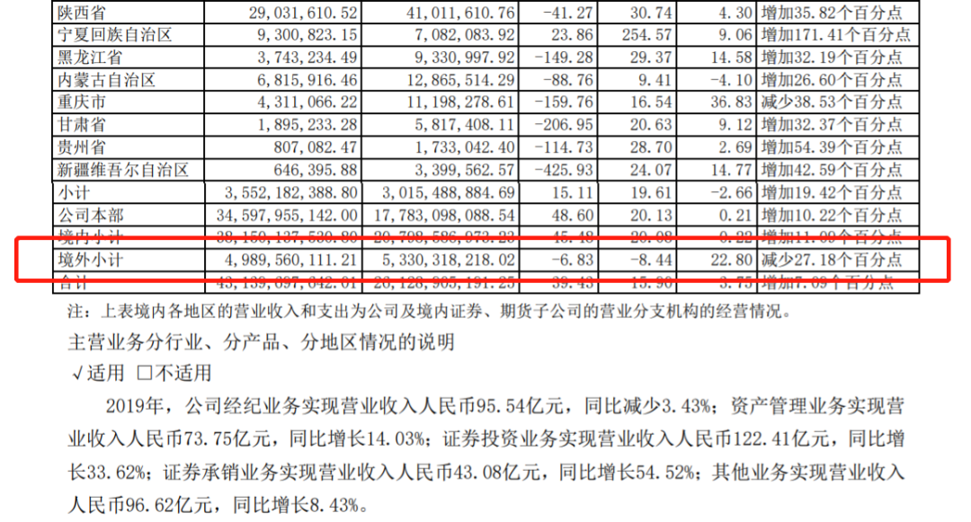 但在2019年年报中,对中信里昂证券的描述只有只言片语。中信证券主营业务分地区情况中,境外业务营收49.9亿元,营业支出53.3亿元,毛利率为-6.83%。整个2019年,中信证券经纪业务手续费净收入同比微降,主要就是受境外业务拖累,由于港股市场持续低迷,中信里昂去年出现亏损。