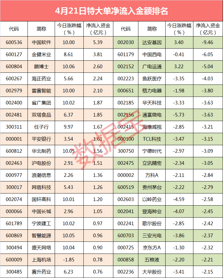 与此同时,今日有22只个股特大单净流出超2亿元。达安基因全天特大单净流出9.46亿元居首。紧随其后是中国西电,全天特大单净流出6.05亿元,排名第三是广电运通,全天特大单净流出5.04亿元。