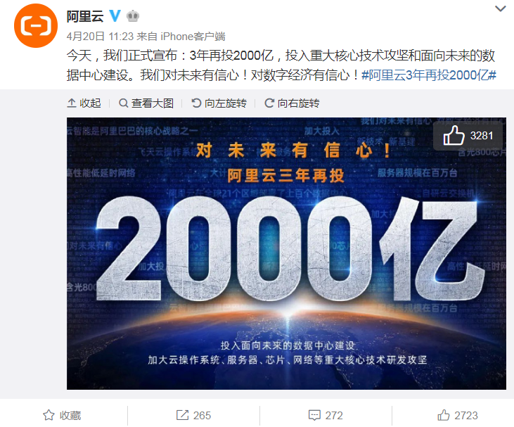 昨日,阿里云微博官宣“抢跑”新基建。阿里云官方微博宣布,未来3年将再投2000亿元,用于云操作系统、服务器、芯片、网络等重大核心技术攻坚和面向未来的数据中心建设。阿里云总裁张建锋表示,对未来有信心,对数字经济有信心!“我们已经坚持投了11年,不会因为疫情减少投入,反而要加大。未来三年2000亿投入搞新技术、新基建。”