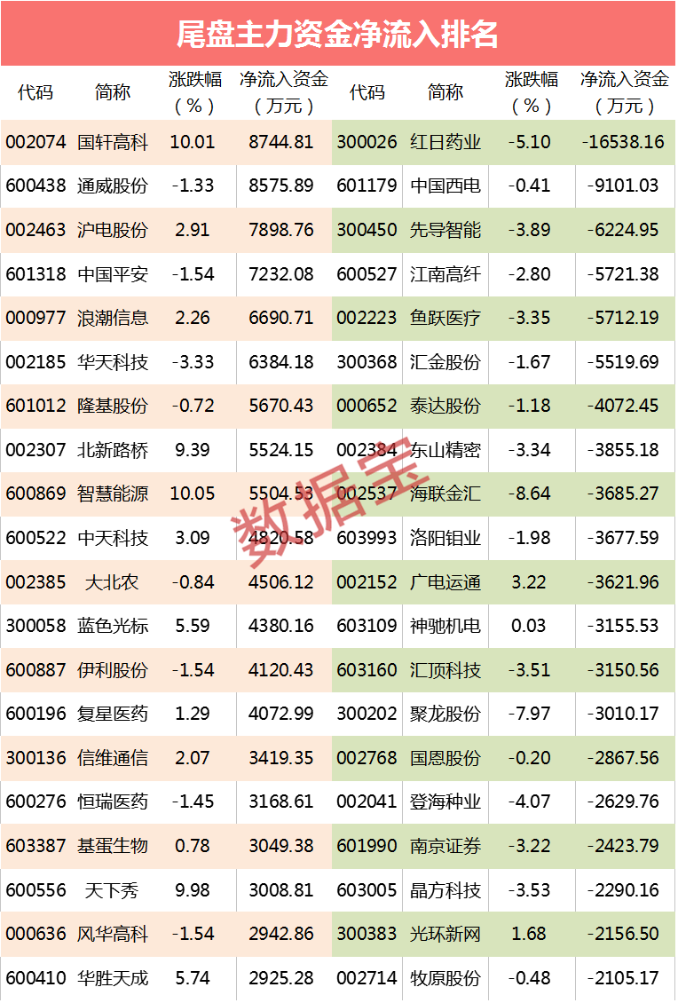 个股方面,尾盘没有一只个股流入超亿元,流入最高的是国轩高科和通威股份,净流入均超8000万元。沪电股份、中国平安尾盘流入超7000万元。尾盘资金流出超亿元个股仅红日药业,流出金额1.65亿元,中国西电流出额均超9000万元。