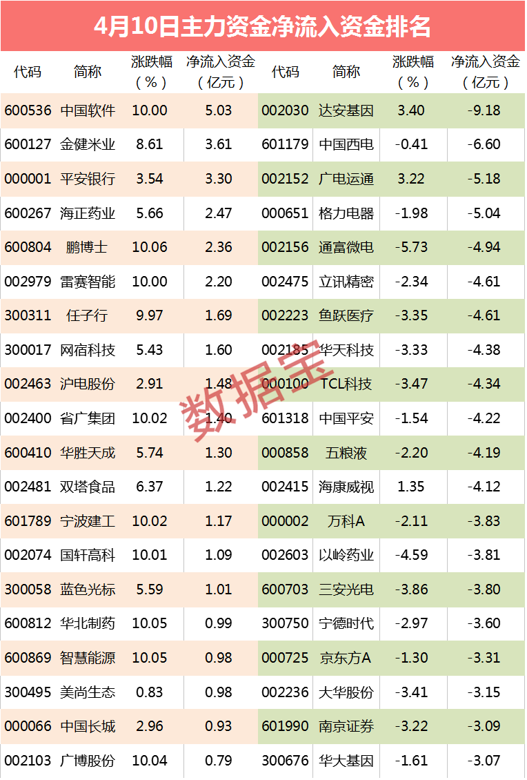 个股方面,主力资金流入超亿元的有15只。中国软件资金流入居首,净流入5.03亿元,股价涨停。公司昨日披露年报显示,去年营收58.2亿元,净利6183万元,同时,公司在年报披露计划2020年实现营业收入100亿元,该计划相比去年营收几乎翻倍。不过,公司表示该计划不构成对投资者的业绩承诺。金健米业资金流入3.6亿元,股价大涨超8%。中国平安资金也流入超3亿元,股价涨幅3.5%。