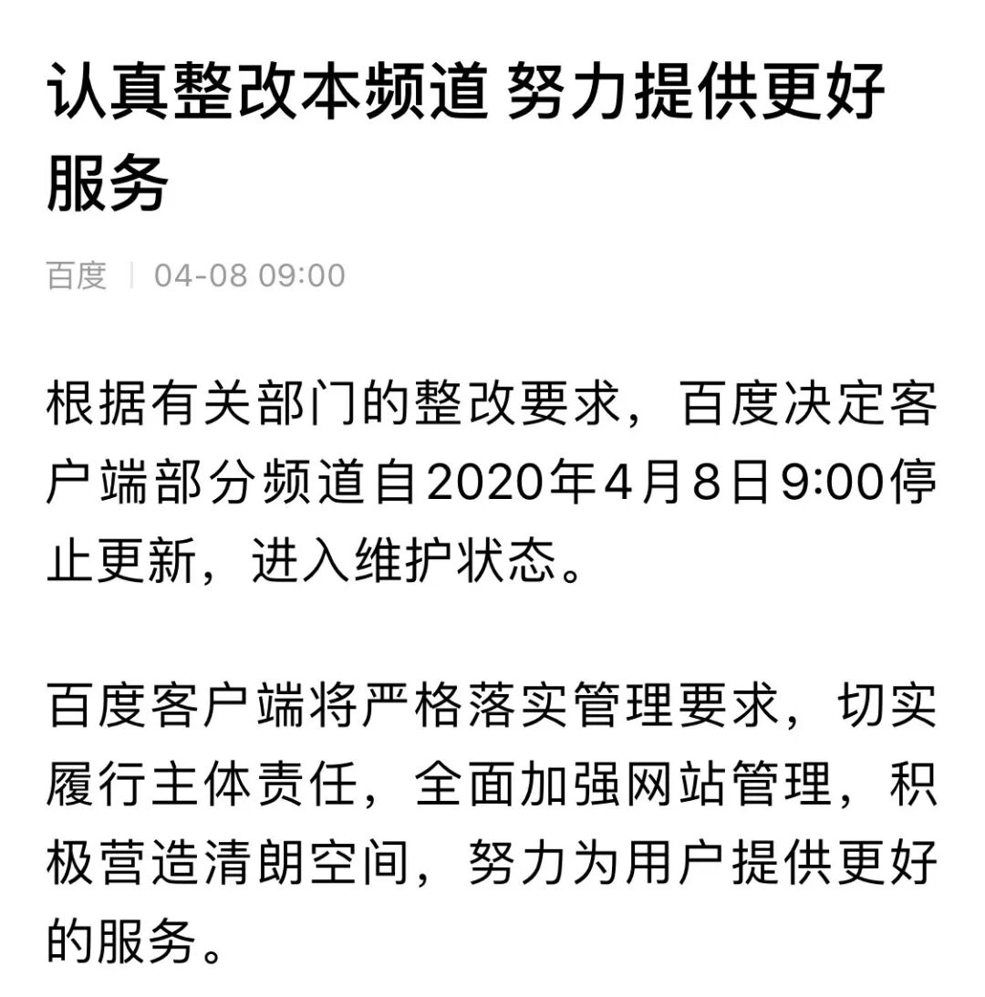 4月7日,国家互联网信息办公室指导北京市互联网信息办公室,针对百度APP多个频道存在严重违规问题,严肃约谈百度公司负责人,要求立即停止违规行为。百度APP推荐频道、图片频道、视频频道、财经频道、科技频道自4月8日上午9时起暂停更新,清理违规内容,开展深入整改。