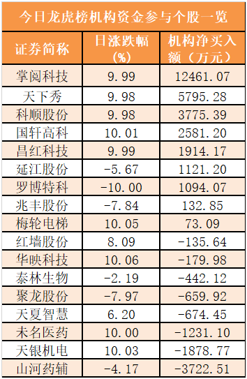 盘后龙虎榜数据显示,机构现身17股,其中掌阅科技等9只股票呈现机构资金净买入,山河药辅等8股呈现机构资金净卖出。