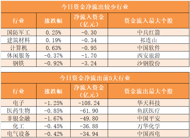 28个申万一级行业中,无一行业实现资金净流入,电子、医药生物、非银金融、化工等行业资金净流出规模居前,其中电子行业净流出108.24亿元居首。
