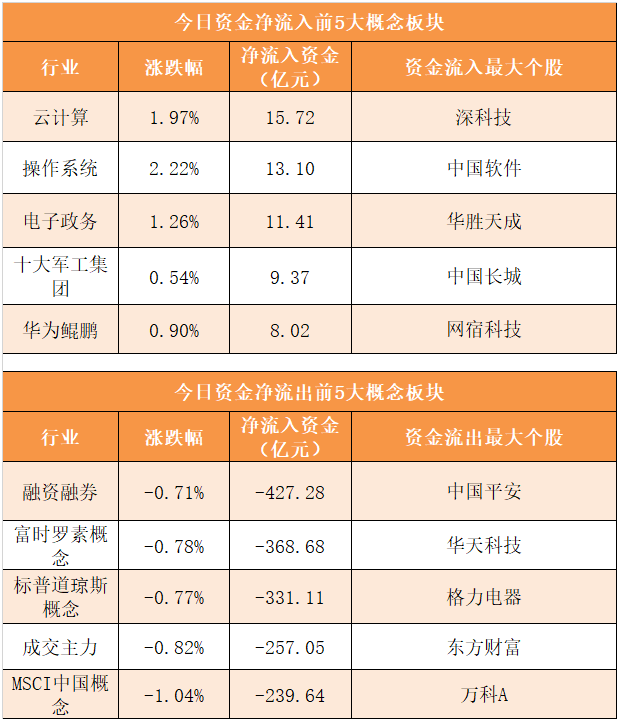 概念板块方面,今日云计算、操作系统、电子政务、十大军工集团等概念板块资金呈现净流入,其中云计算概念净流入15.72亿元居首。