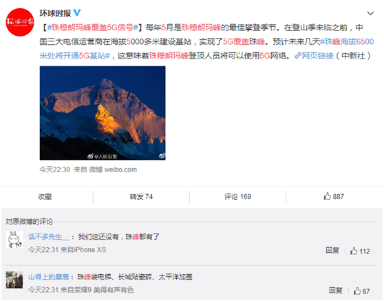 显然,疫情肆虐并未阻挡5G建设的开展。近日,生命禁区珠穆朗玛峰本月内将覆盖5G信号的消息再次让我们见识到中国5G建设的实力与速度。4月20日,华为中国在官方微博称将助力三大运营商在珠峰完成5G基站开通工作。同日,中国移动自今年4月以来正式启动的“5G上珠峰”专项行动取得实质性进展,已上线珠峰VR直播,已完成珠峰大本营、过渡营地等5G基站开通工作,预计4月25日前中国移动5G信号将覆盖到珠峰峰顶。4月19日,中国电信已经在珠峰上开通5G网络服务,并对珠峰进行全天候的实时直播。